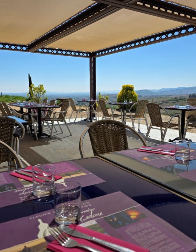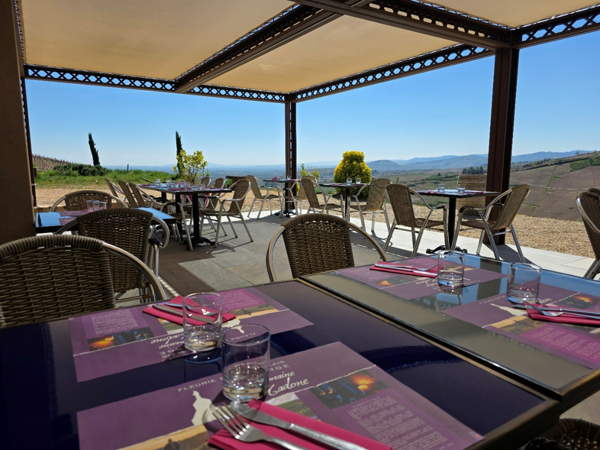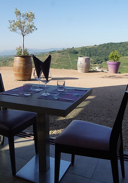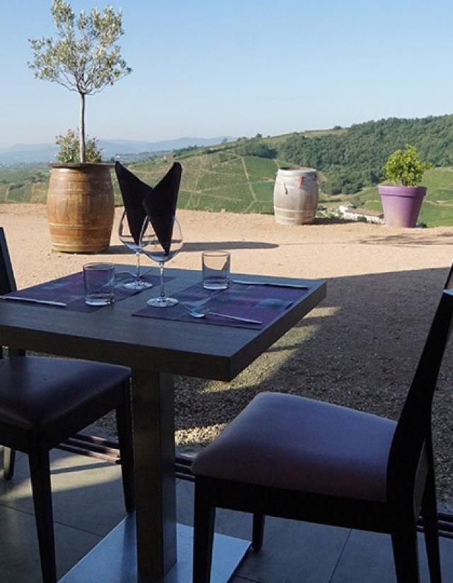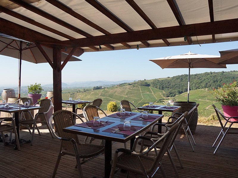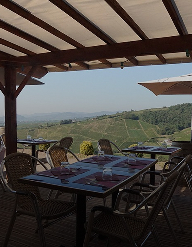 Que ce soit en salle (climatisée d’une capacité de 70 couverts) ou en terrasse vous profiterez d’une vue panoramique sur le vignoble et la vallée de la Saône.